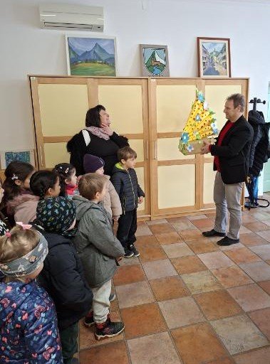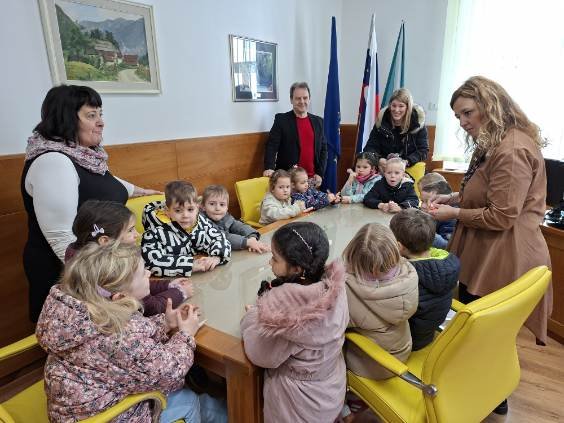 Bovec – Včeraj, 24. februarja, so župana Občine Bovec Valterja Mlekuža obiskali otroci iz vrtca Bovec, skupina Ptički, pod vodstvom Renate Mlekuž, Tanje Fratnik in Rebeke Klobučar. V občinske prostore so prinesli veliko dobre volje, za sprejemno pisarno tudi pomladno dekoracijo, in poskrbeli za odlično vzdušje. Izkazali so se tudi kot odlični pevci, recitatorji in celo poznavalci zastav. Župan Valter Mlekuž jim je namreč razkazal tudi svojo pisarno, ki jo krasijo tri zastave, otrokom pa podrobneje obrazložil pomen grba in občinske zastave. Kot je ob koncu obiska dejal Mlekuž, so otroci iz skupine Ptički zelo prijetna in zvedava druščina. Za zaključek svojega obiska so se otroci posladkali še s čokoladico.