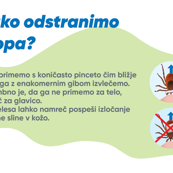 Če klopa opazimo, ga čim prej odstranimo s pinceto, tako da ga primemo čim bližje koži in enakomerno izvlečemo. Pomembno je, da ga ne stiskamo za telo, saj lahko to poveča tveganje za prenos okužbe.